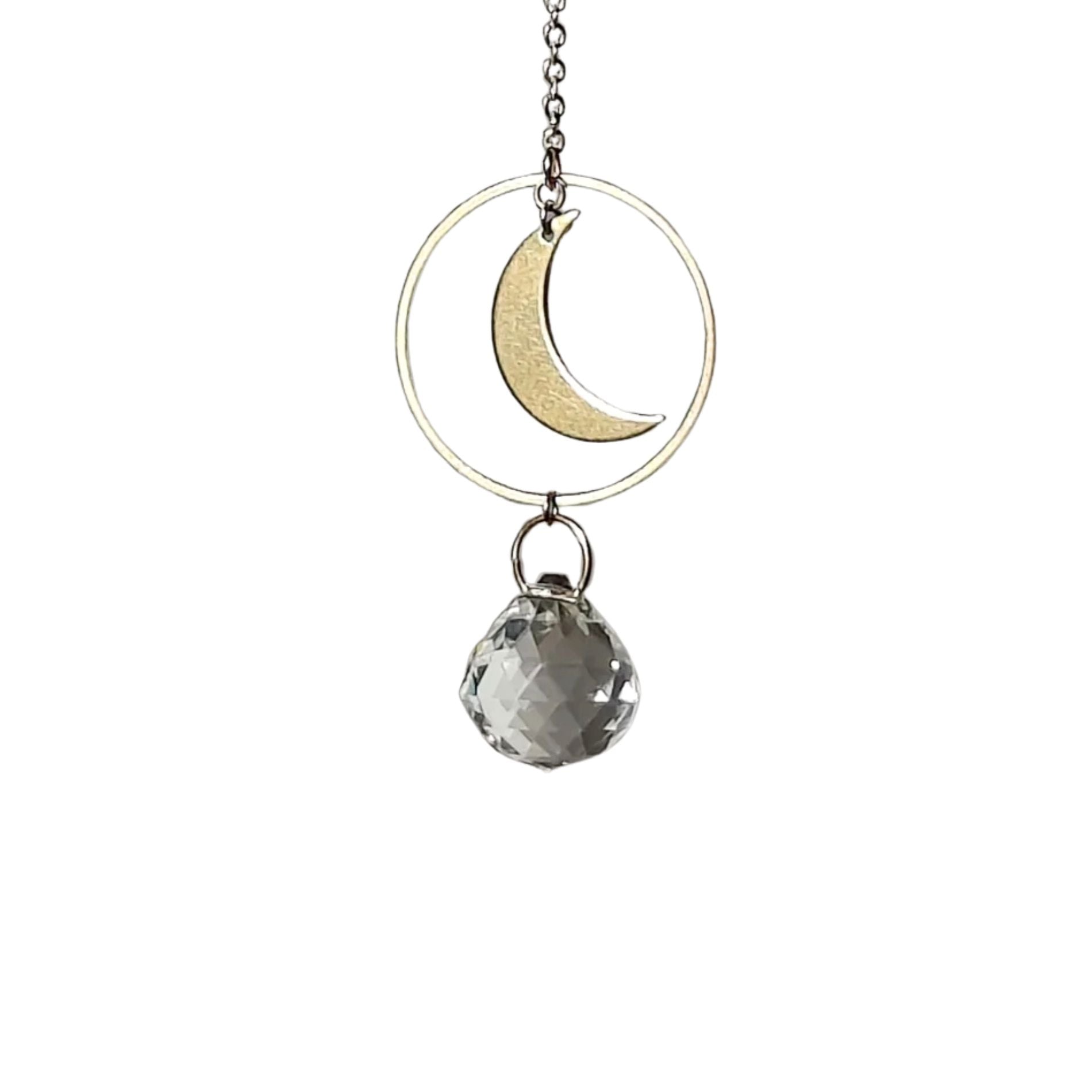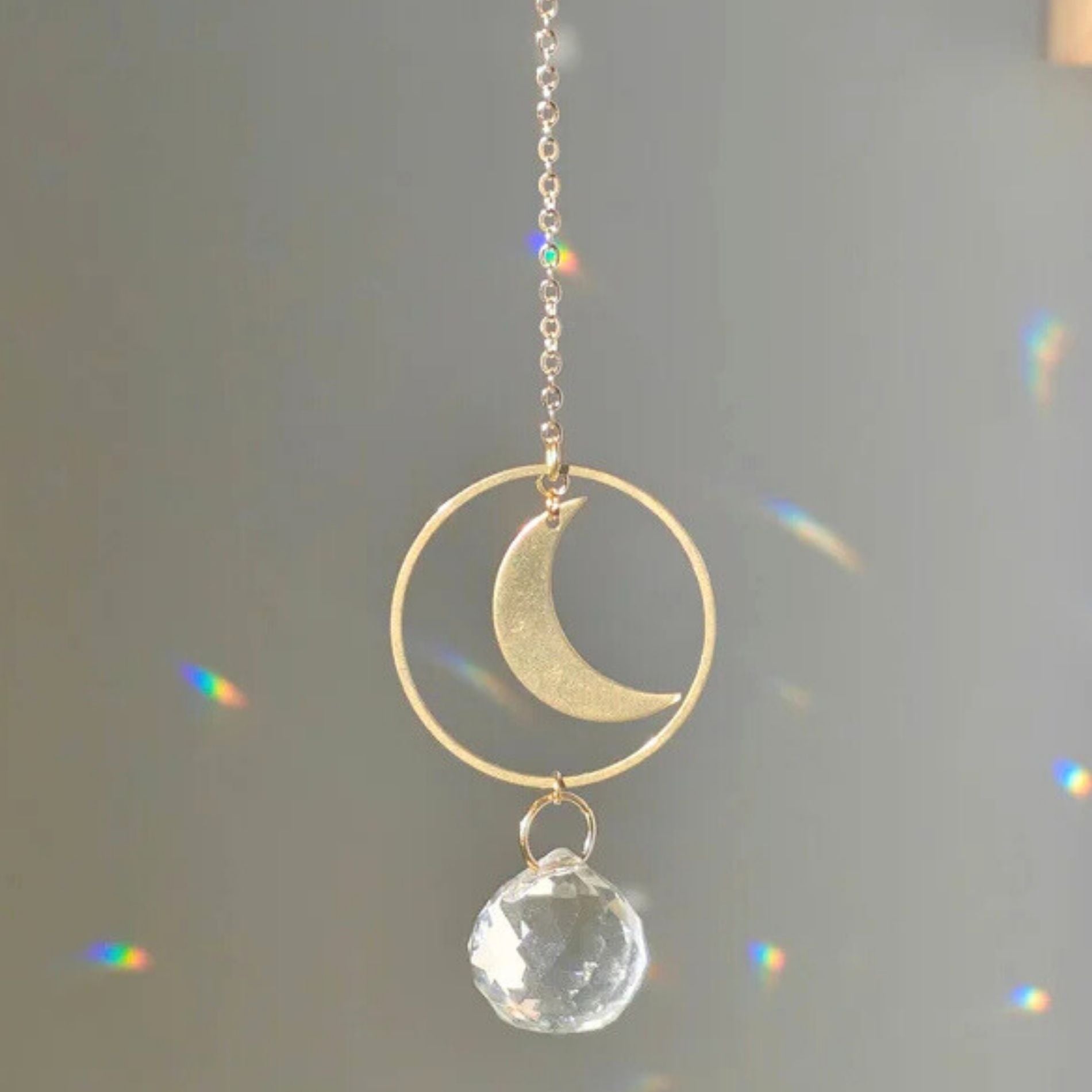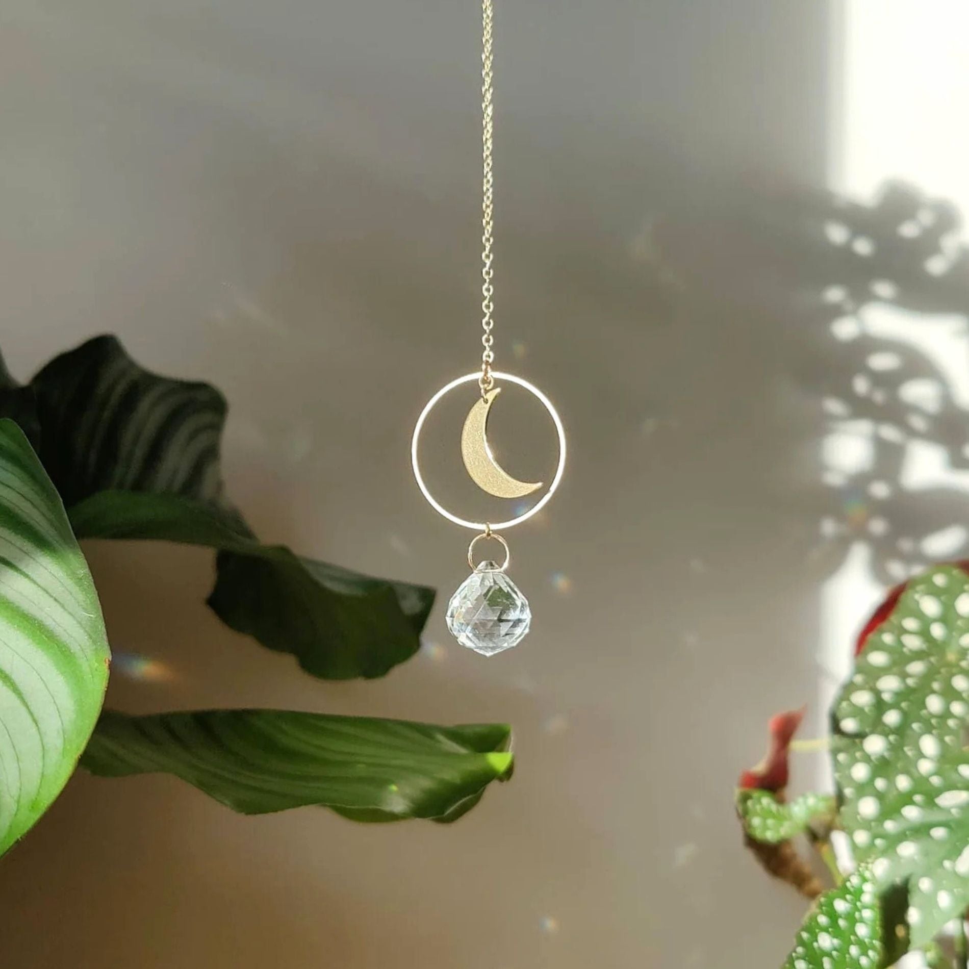 Deze mini zonnespeler is met de hand gemaakt van ruw messing en helder glas. Wanneer het daglicht de kristallen raakt, verschijnen zachte lichtpuntjes en fijne regenboogreflecties — nooit fel, altijd subtiel.