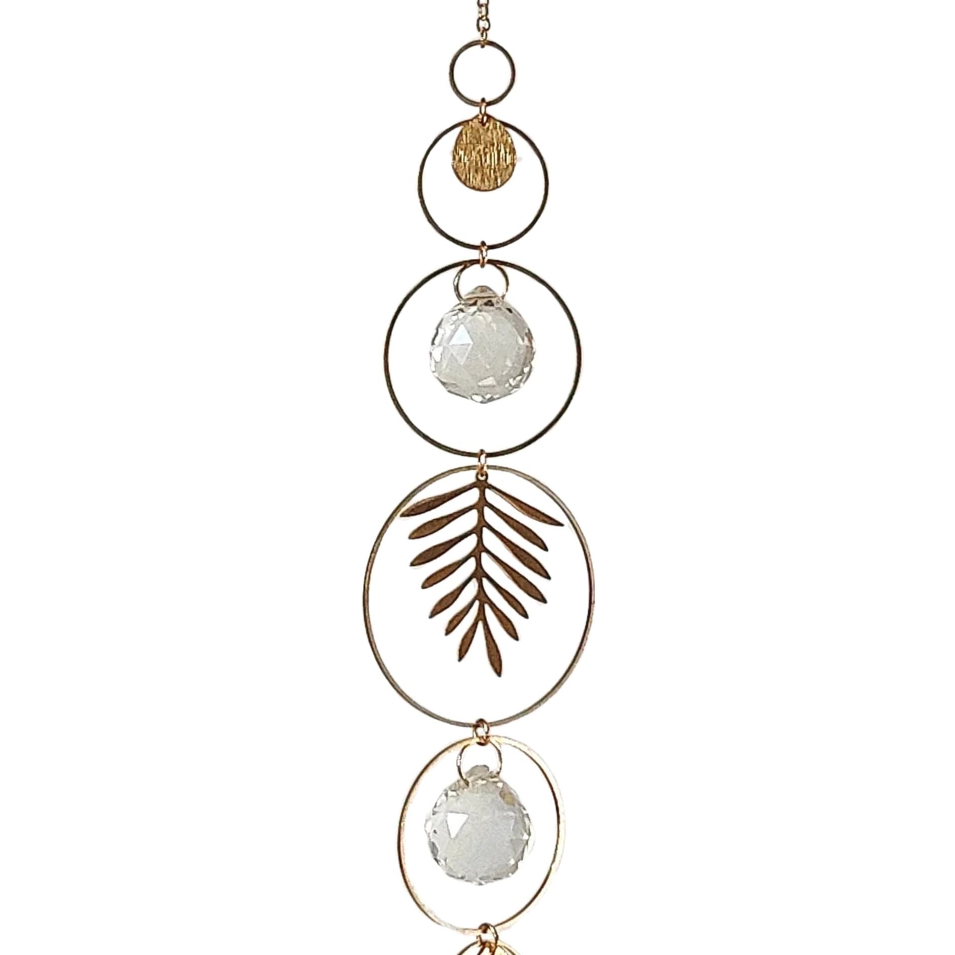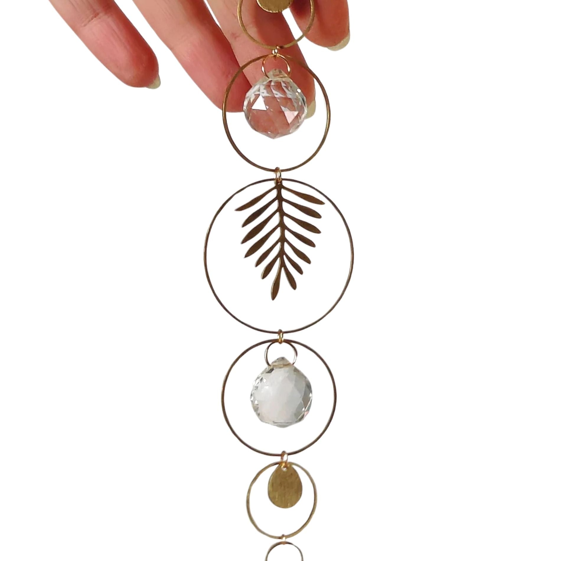 Deze zonnevanger is met de hand gemaakt van ruw messing en glazen kristallen. Wanneer het daglicht haar raakt, verspreidt ze subtiele reflecties door de ruimte — rustig, warm en nooit overheersend.