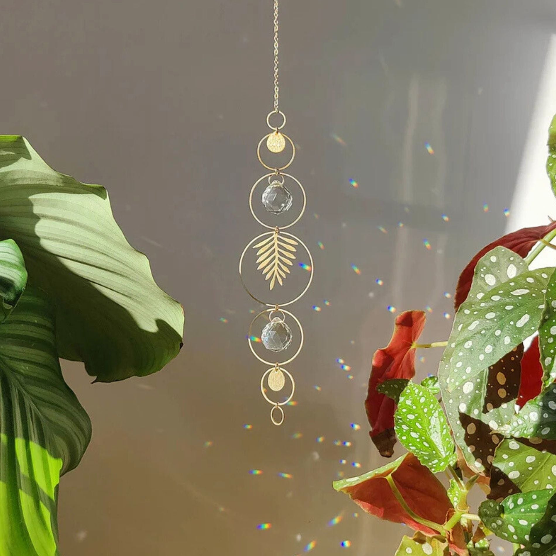 Hang Gaïa voor een raam, aan een haak of bij een rustige plek in huis. Ze beweegt mee met de zon en nodigt uit om even te vertragen en te kijken.